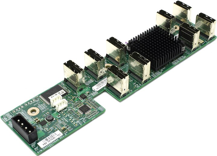 Входящие в комплектацию элементы (1) expander board, (6) short mini-sas cables, (3) screws and bumpers