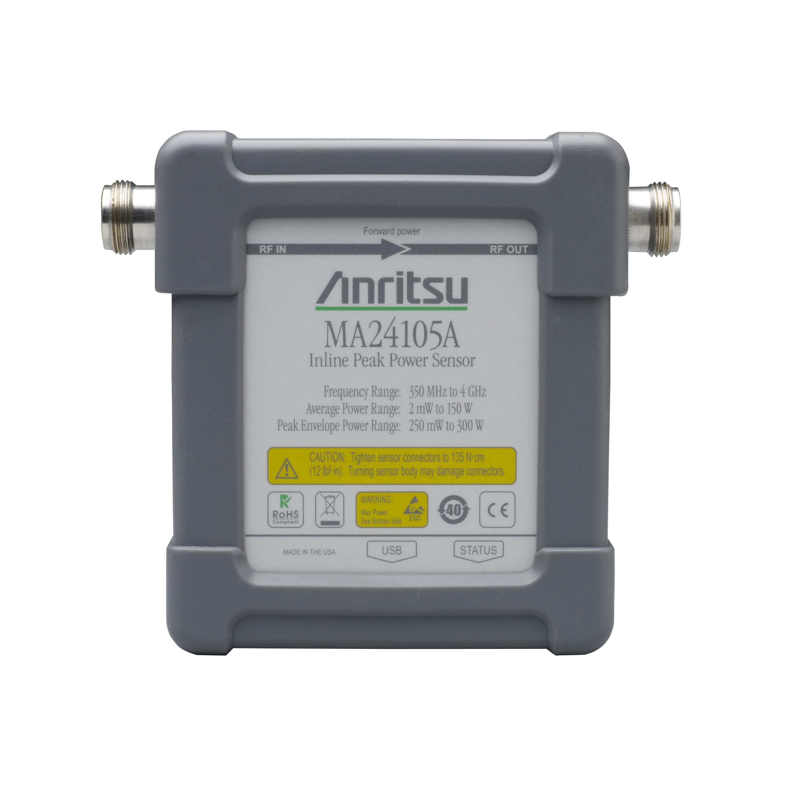 Тип датчика: Промежуточный датчик пиковой мощности; Диапазон частот: от 350 МГц до 4 ГГц; Диапазон измерений: от +3 дБмВт до +51,76 дБмВт; Тип разъема: N-тип (гнездовой разъем); Совместимость: Переносные измерительные приборы Anritsu и ПК с программным обеспечением PowerXpert. Site Master (S3xxE), Spectrum Master (MS271xE и MS2720T), Cell Master (MT821xE), BTS Master (MT822xB), VNA Master (MS202xA/B и MS203xA) и MS271xB.
